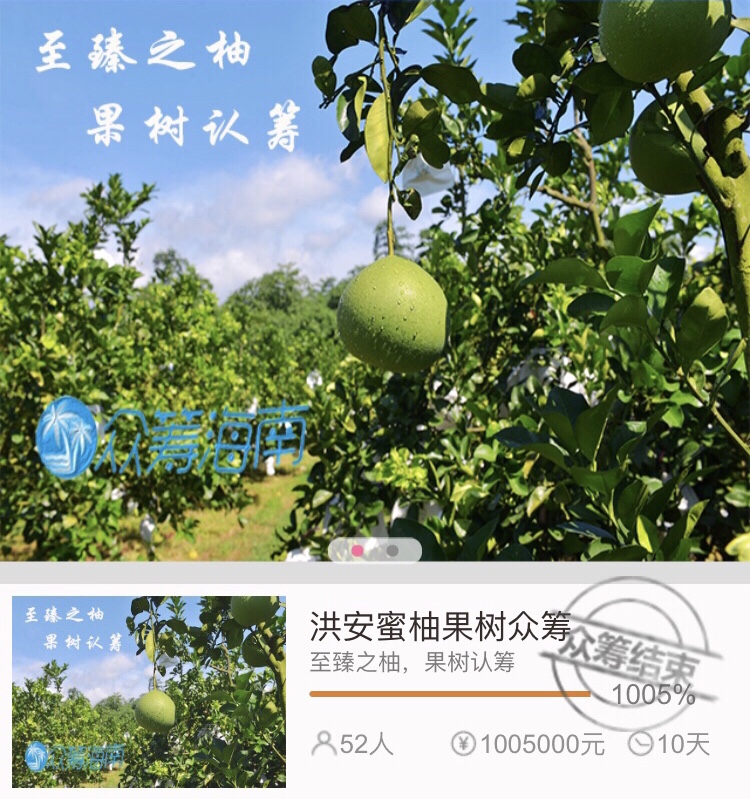 近日,海南股權(quán)交易中心洪安蜜柚果樹眾籌項目圓滿結(jié)束。今年以來,股交中心通過積極探索,經(jīng)過專業(yè)的風(fēng)控體系把控以及嚴(yán)格的產(chǎn)品審核,在原有的實物眾籌的基礎(chǔ)上打造了本單“洪安蜜柚果樹眾籌”,目標(biāo)金額10萬元,最...