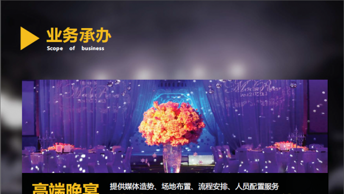 | 主營業(yè)務(wù): | 電腦圖文設(shè)計制作、企業(yè)形象策劃、展覽展示服務(wù)、市場調(diào)研、攝影服務(wù)、資料翻譯服務(wù)、禮儀服務(wù)、賽事活動策劃、公共活動策劃、快遞服務(wù)、室內(nèi)保潔服務(wù)、婚慶禮儀服務(wù)、餐飲管理。 |