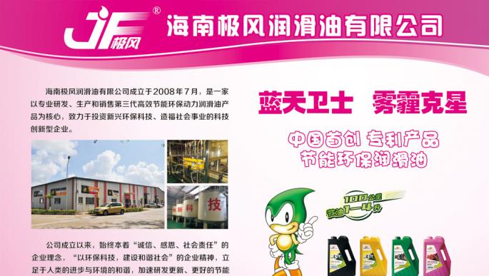 | 企業(yè)說明: | 海南極風高科技股份有限公司是以專業(yè)研發(fā)、生產(chǎn)和銷售節(jié)能環(huán)保潤滑油產(chǎn)品為核心,致力于投資新興環(huán)??萍?、造福社會事業(yè)的高新技術(shù)企業(yè)。 自主研發(fā)生產(chǎn)的 “極風牌”節(jié)能環(huán)保汽車發(fā)動機潤滑油,以其有效降低汽車尾氣碳氫化合物(HC)和一氧化碳(CO)排放量的環(huán)保功能,平均節(jié)油率17.47%(百公里節(jié)省燃油1-4升),有效降低汽車尾氣PM2.5顆粒物排放達36.4%,HC、CO、NOX等有毒有害氣體排放數(shù)據(jù)均優(yōu)于歐Ⅴ標準,堪稱藍天衛(wèi)士、霧霾克星。因此,深受廣大用戶的認可和好評,迅速成為汽車(船)發(fā)動機潤滑油換代升級首選的領(lǐng)先產(chǎn)品。 回顧海南極風高科技股份有限公司的創(chuàng)業(yè)歷程,就是堅持理想創(chuàng)新發(fā)展的實踐歷程。2011年8月在中國(三亞)國際熱帶雨林汽車越野挑戰(zhàn)賽上,“極風”成為自由島參賽車隊專用潤滑油,并助力該車隊奪得第三名,實現(xiàn)了歷史性的突破。 2011年11月獲得海南省高新技術(shù)項目認定。 2013年2月獲得國內(nèi)同行業(yè)唯一的國家發(fā)明專利授權(quán),發(fā)明專利名稱:節(jié)能環(huán)保汽車發(fā)動機潤滑油,專利號:ZL 201110095592.6。 2013年8月順利通過ISO9001質(zhì)量管理體系認證。 2013年5月獲得全國交通運輸節(jié)能減排推薦產(chǎn)品(技術(shù))榮譽。 2015年10月被評為高新技術(shù)企業(yè)。 公司為邁向資本市場做好準備,于2015年進行了股份制改制。 今天,“極風”正以中華傳統(tǒng)文化“太極”之“極”、漢唐精神“大風歌”之“風”植根市場,深入人心。
