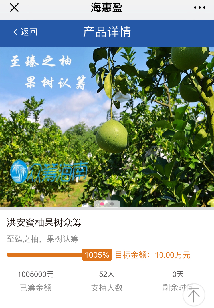 去年底,為了幫助企業(yè)解決短期資金流轉(zhuǎn)問(wèn)題,海南股權(quán)交易中心聯(lián)合掛牌企業(yè)澄邁洪安農(nóng)業(yè)開發(fā)有限公司發(fā)起了存續(xù)期為9個(gè)月的“洪安蜜柚果樹眾籌”項(xiàng)目,項(xiàng)目在股交中心綜合金融服務(wù)平臺(tái)“?;萦卑l(fā)布后短時(shí)間內(nèi)達(dá)成了募集資金目標(biāo),最終募集金額達(dá)100.5萬(wàn)元。