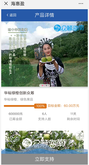 本單創(chuàng)新眾籌以綠橙為產(chǎn)品標(biāo)的,不同于?;萦脚_(tái)其他實(shí)物眾籌的實(shí)物類的回報(bào)方案,此次綠橙眾籌項(xiàng)目提供“實(shí)物”和“代銷收益”兩種回報(bào)方案,產(chǎn)品存續(xù)期為14個(gè)月,即產(chǎn)品到期日是2020年1月份,認(rèn)籌用戶到期可根據(jù)認(rèn)籌時(shí)選擇的回報(bào)方案獲得相應(yīng)的回報(bào)。