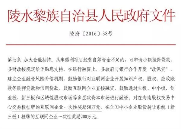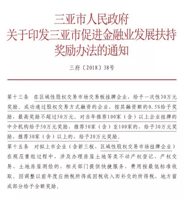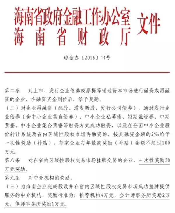 在國家采取精準(zhǔn)有效措施大力支持中小微企業(yè)發(fā)展,解決中小微企業(yè)融資難、融資貴難題的大背景下。從2015年開始,海南省各級政府密集出臺鼓勵企業(yè)掛牌區(qū)域性股權(quán)交易市場(即四板市場)的政策。同時,在股份改制、掛牌、融資等方面,給予掛牌企業(yè)財(cái)政獎勵,以實(shí)際行動助力中小微企業(yè)對接資本市場,做大做強(qiáng)。