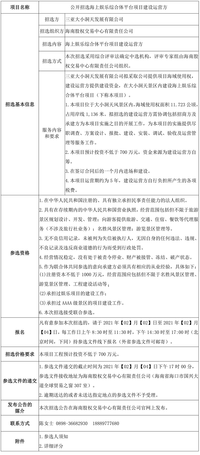 根據(jù)相關(guān)法律法規(guī),受委托,海南股權(quán)交易中心有限責(zé)任公司公開招選海上娛樂(lè)綜合體平臺(tái)項(xiàng)目建設(shè)運(yùn)營(yíng)方,為三亞大小洞天景區(qū)的海上娛樂(lè)綜合體平臺(tái)項(xiàng)目提供盡職調(diào)查、項(xiàng)目報(bào)批、建設(shè)、生產(chǎn)、安裝、調(diào)試、驗(yàn)收及運(yùn)營(yíng)管理等服務(wù)工作。歡迎符合條件的機(jī)構(gòu)遵照本公告的有關(guān)規(guī)定報(bào)名參加,現(xiàn)將有關(guān)事項(xiàng)公告如下: