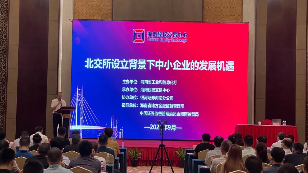 為幫助我省中小企業(yè)深入了解北京證券交易所,掌握資本市場的新機(jī)遇,9月24日,海南省工業(yè)和信息化廳聯(lián)合海南股權(quán)交易中心邀請業(yè)內(nèi)資深專家舉行“北交所設(shè)立背景下中小企業(yè)的發(fā)展機(jī)遇”主題培訓(xùn),幫助中小企業(yè)熟悉資本市場規(guī)則,適應(yīng)新形勢做好上市路徑規(guī)劃。海南省工業(yè)和信息化廳、海南省地方金融監(jiān)督管理局、中國證監(jiān)會海南監(jiān)管局、海南省工商聯(lián)及我省多家新三板掛牌企業(yè)、重點(diǎn)上市后備企業(yè)、專精特新企業(yè)代表和金融機(jī)構(gòu)、投資機(jī)構(gòu)、券商、商協(xié)會代表約200人參加活動(dòng)。