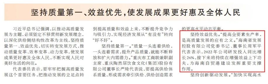 “提高全要素生產(chǎn)率,是高質(zhì)量發(fā)展的應(yīng)有之義?!?/span>海南省發(fā)展控股有限公司黨委書(shū)記、董事長(zhǎng)周軍平代表表示,2022年公司研發(fā)投入同比增長(zhǎng)26%,接下來(lái)將持續(xù)在增強(qiáng)效益上下功夫,為海南自貿(mào)港建設(shè)發(fā)揮重要支撐作用。