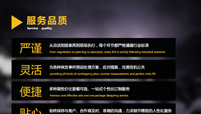 | 主營業(yè)務(wù): | 電腦圖文設(shè)計制作、企業(yè)形象策劃、展覽展示服務(wù)、市場調(diào)研、攝影服務(wù)、資料翻譯服務(wù)、禮儀服務(wù)、賽事活動策劃、公共活動策劃、快遞服務(wù)、室內(nèi)保潔服務(wù)、婚慶禮儀服務(wù)、餐飲管理。 |