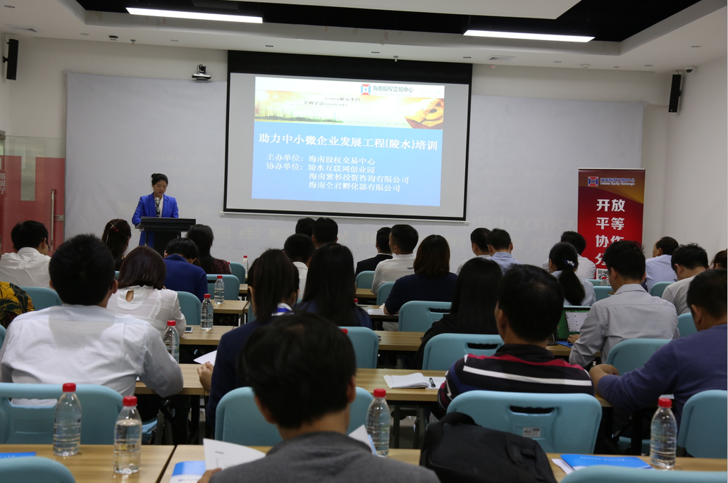 2月20日下午,海南股權(quán)交易中心主辦的“助力中小微企業(yè)發(fā)展工程”系列活動(dòng)——陵水站成功舉辦。本次活動(dòng)在陵水互聯(lián)網(wǎng)創(chuàng)業(yè)園、海南仝君孵化器有限公司、海南紫衫投資咨詢(xún)有限公司共同協(xié)辦下舉行,活動(dòng)旨在通過(guò)“助力中小微企業(yè)發(fā)展工程”使更多的中小微企業(yè)獲得發(fā)展。海南股權(quán)交易中心副總經(jīng)理程棟才,陵水互聯(lián)網(wǎng)創(chuàng)業(yè)園負(fù)責(zé)人、海南仝君孵化器有限公司運(yùn)營(yíng)總監(jiān)陳烈,中國(guó)股權(quán)激勵(lì)研究院海南分院院長(zhǎng)、深圳華一世紀(jì)海南分公司總經(jīng)理李瑞,海南銀行陵水支行、屯昌縣農(nóng)村信用社,以及50家企業(yè)家代表參加此次培訓(xùn)。
