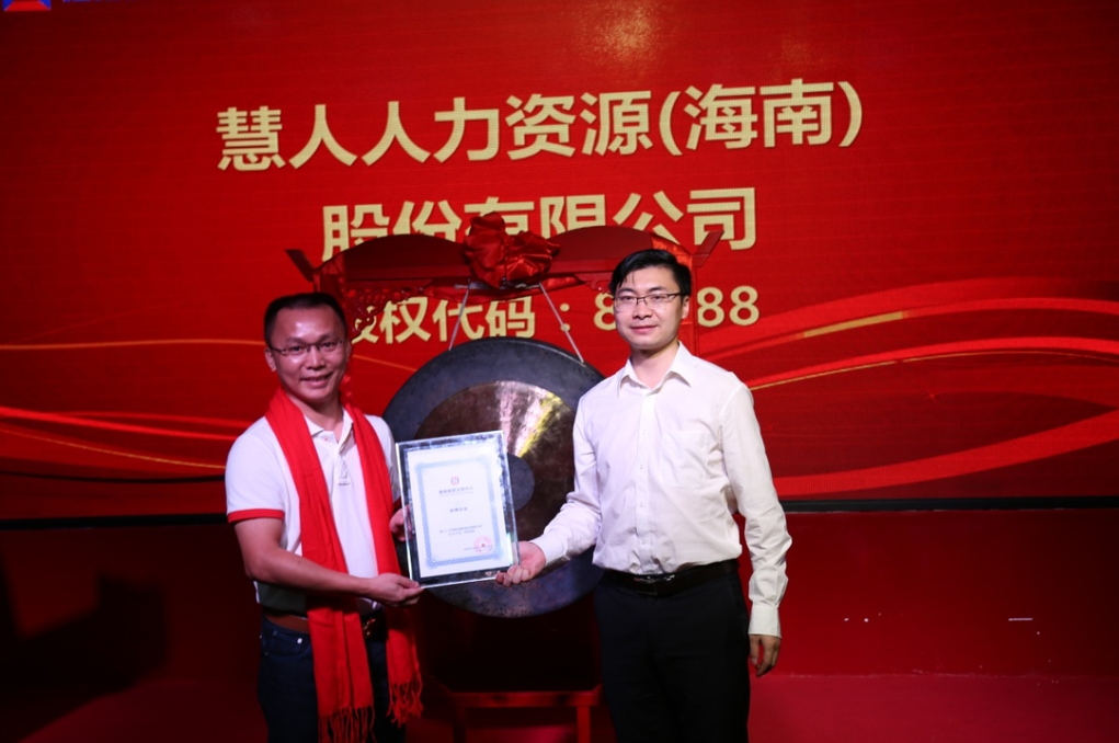 4月27日上午,海南股權交易中心在??趶团d城黑馬會路演中心舉辦慧人人力資源(海南)股份有限公司專場掛牌儀式。海南省科技廳副廳長、海南省知識產(chǎn)權局局長朱東海,股交中心副總經(jīng)理程棟才,慧人股份董事長林遍地,海南紫杉投資咨詢有限公司董事長韓晶晶以及30家企業(yè)參加。