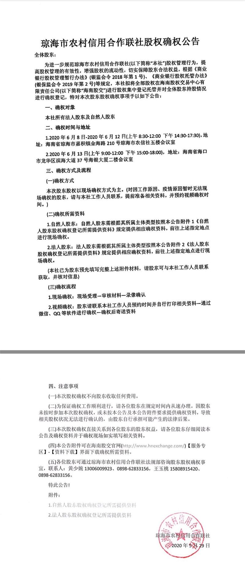 瓊海市農(nóng)村信用合作聯(lián)社股權(quán)確權(quán)公告