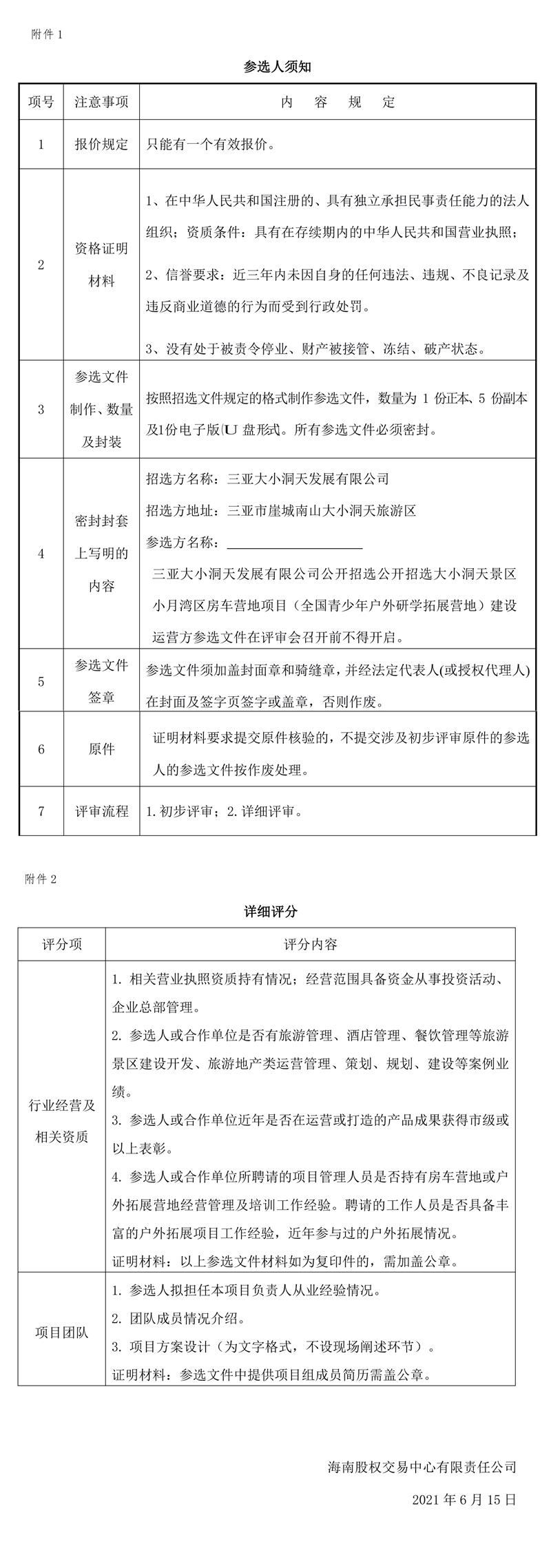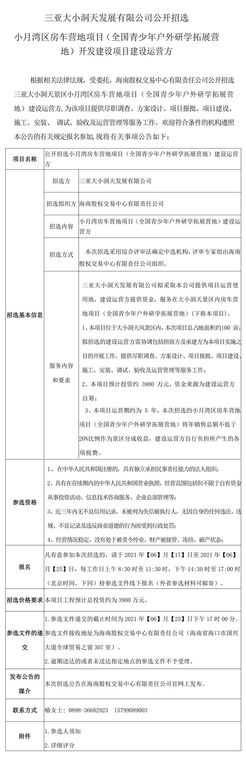 三亞大小洞天發(fā)展有限公司公開招選 小月灣區(qū)房車營地項目(全國青少年戶外研學(xué)拓展?fàn)I地)開發(fā)建設(shè)項目建設(shè)運營方