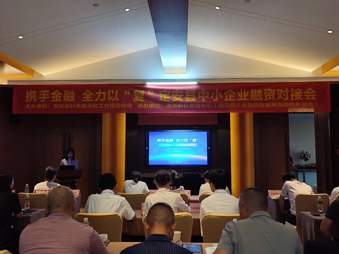 此次活動由定安縣科工信局主辦、海南股權(quán)交易中心承辦。定安縣科工信局、定安縣農(nóng)業(yè)農(nóng)村局、定安縣旅文局、定安縣工商業(yè)聯(lián)合會、金融機構(gòu)相關(guān)負責人及企業(yè)代表近50人參加會議。